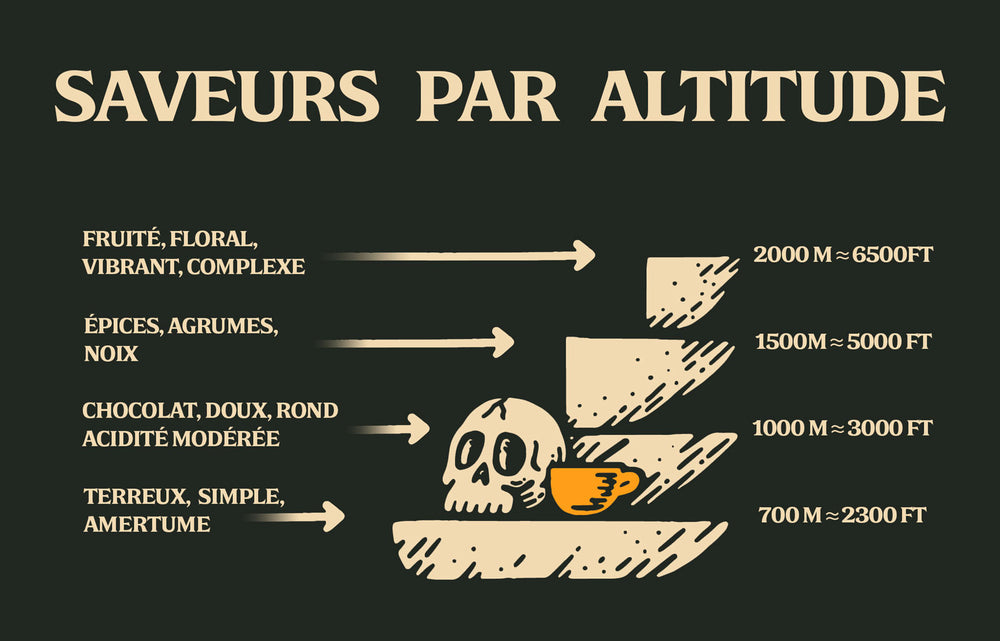 It is then possible to take altitude into consideration when purchasing coffee beans. To simplify: if you prefer a more classic and round coffee, choose a lower elevation. On the other hand, if you like higher acidity and more complex flavours, head towards a higher elevation. While elevation alone doesn't dictate the taste of coffee, it does provide a substantial clue regarding what nuances might find their way into your cup.